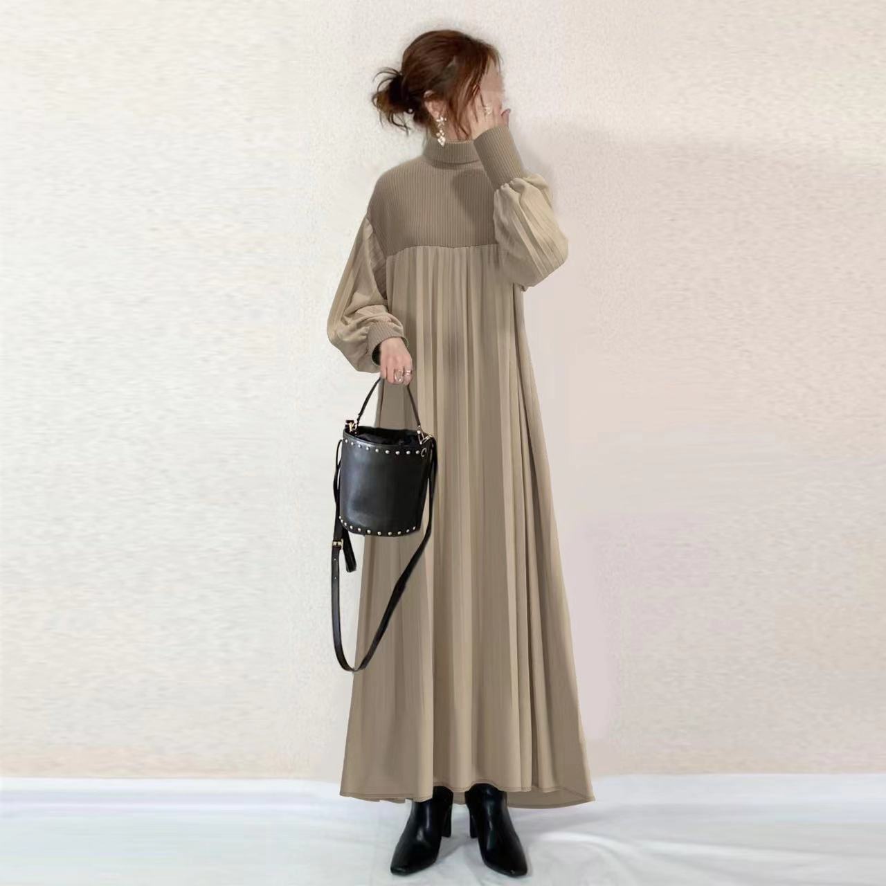 レディース ワンピース ニットワンピ ロングワンピ ロング 長袖 タートルネック フレア ベルベット フリーツ ツーピース風 切り替え エレガント 上品 大人可愛い きれいめ 無地 秋 冬 20代 30代 40代 デート お出かけ レストラン 女子会 コンサート 韓国 体型カバー 着回し トレンド S M L 黒 ブラック アプリコット