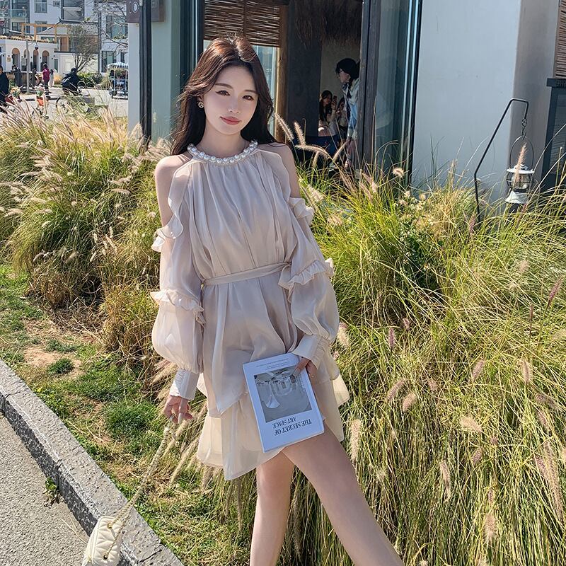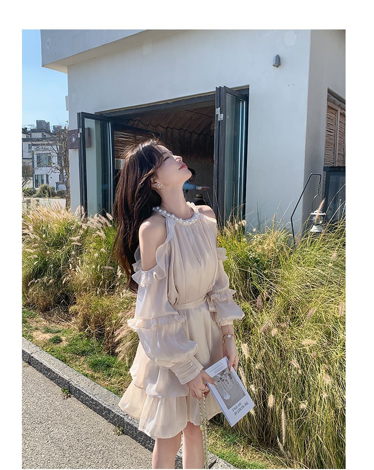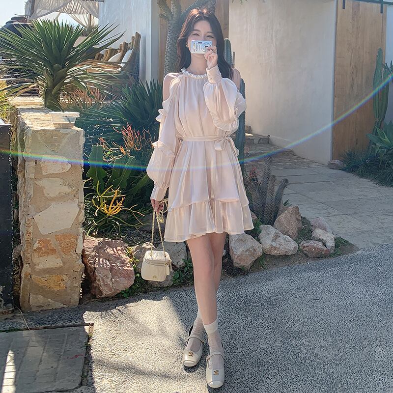 レディース ワンピース オフショルダー ロング 袖なし オフショル フレア リボン フリル レース 体型カバー 大人可愛い エレガント 上品 おしゃれ 無地 春 夏 リゾート デート お出かけ 旅行 女子会 パーティー トレンド 清楚 モテ 着回し 20代 30代 40代 S M L XL アイボリー ベージュ