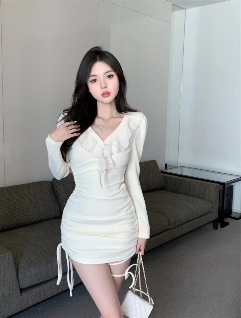 レディース ワンピース ミニワンピ 長袖 Vネック タイト リボン ドロストデザイン ボタン ウエストマーク 大人可愛い きれいめ セクシー 上品 無地 秋 冬 春 20代 30代 デート お出かけ 女子会 パーティー 合コン モテ 着回し トレンド S M L XL ホワイト アプリコット