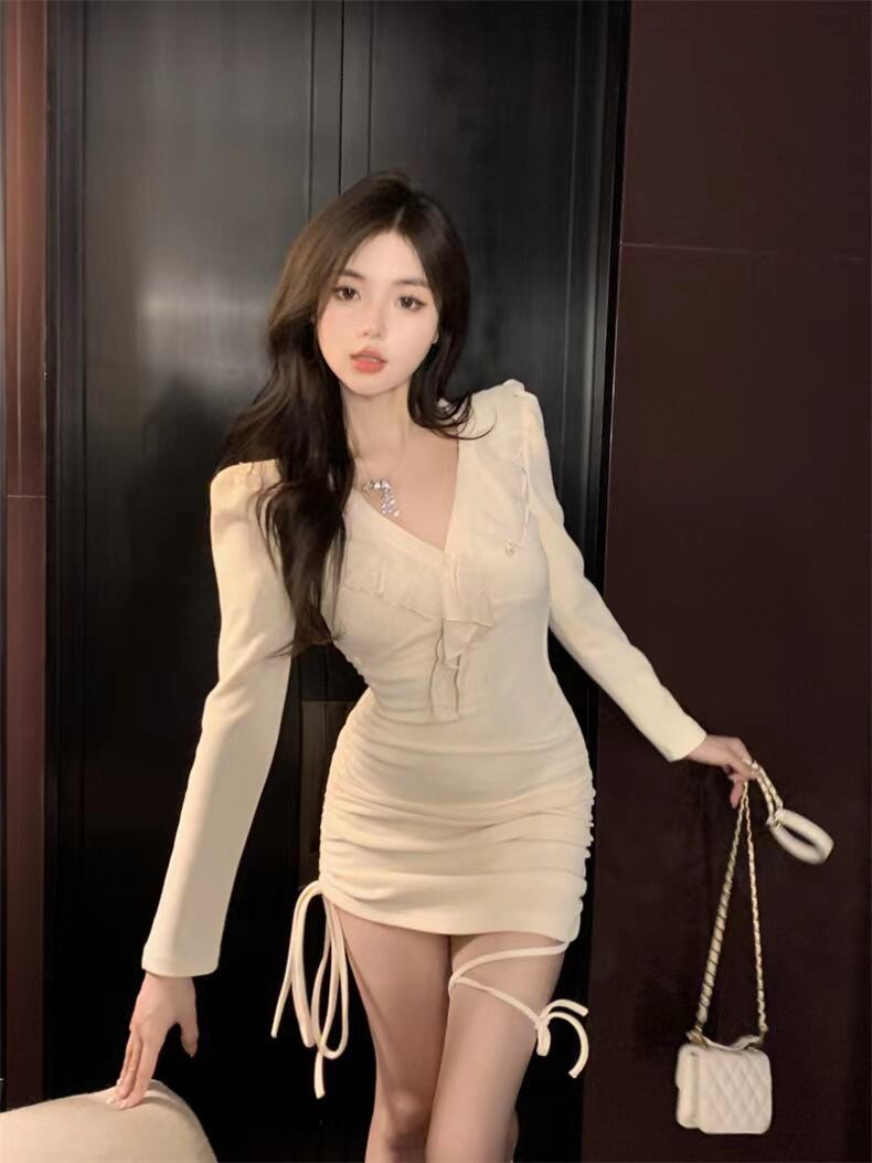 甘さとセクシーさを絶妙に融合させたミニ丈ワンピース。Vネックとドロストデザインが女性らしいシルエットを演出し、デートや女子会など特別なシーンで周りの視線を集めます。体のラインを美しく見せるタイトシルエットで、スタイルアップが叶う一着です。