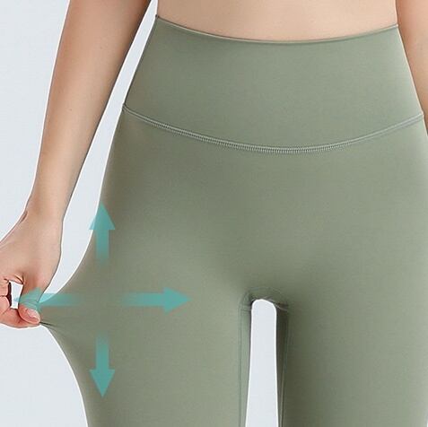 くすみカラーのハイウエストの速乾フィットネスパンツ。