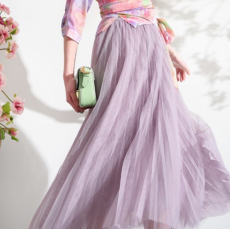 春カラーのチュールのプリーツロングスカート。