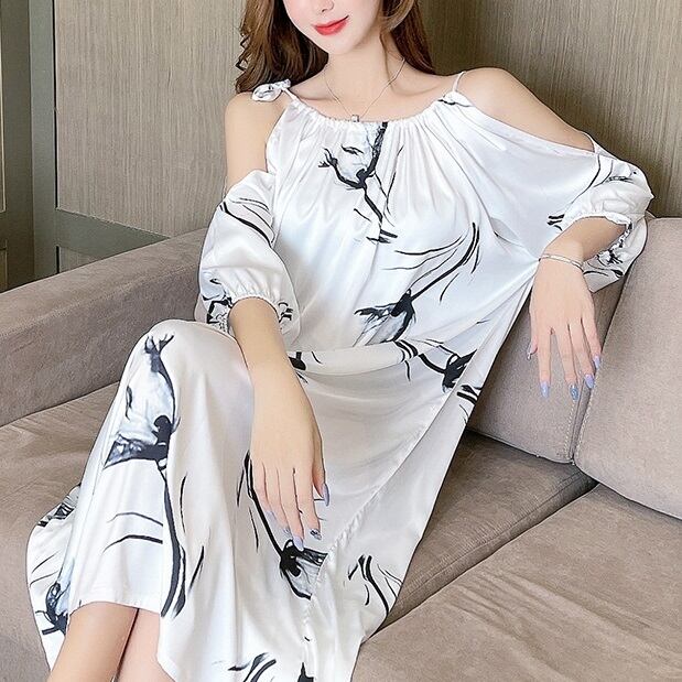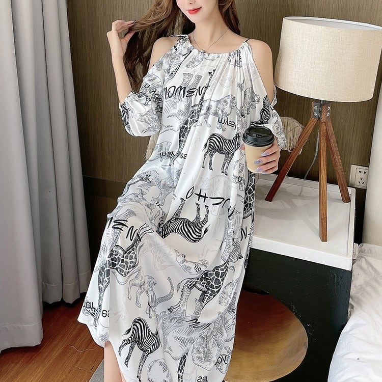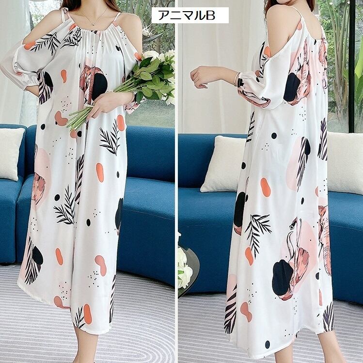 アイスシルク ナイトウェア 夏 スリングドレス オフショルダー オープンショルダー 調整可能 ロング丈 ビッグサイズ ビッグシルエット プリント柄 ホームウェア ビッグフレア ゆったり おしゃれ 着やすい ファッショナブル スマート見え スッキリ見え 大人女子 レディース 学生 OL エイジレス お泊り 体型カバー 華奢見え ヤセ見え サマ見え こなれ感 M L XL ブラック ブルーグリーン アニマル フラワー | Bonny Me