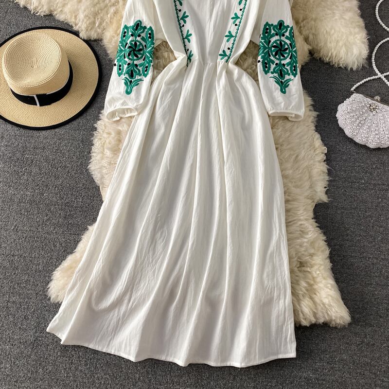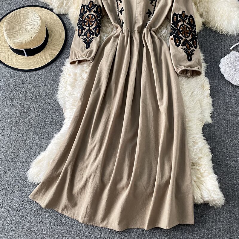 ワンピース フレアワンピース ワンピドレス ミモレ丈 ロング丈 長袖 キーネック フレア セミフレア 刺繍 ウエストマーク 切り替えデザイン 大人可愛い シンプル カジュアル おしゃれ お洒落 大人女子 こなれ感 ラフ ガーリー 個性的 主役級 存在感 抜け感 無地 柄 春 秋 10代 20代 30代 レディース 女性用 デート お出かけ 女子会 休日 イベント 旅行 着回し 普段使い 重ね着 韓国系 オルチャン ファッション コーデ スタイル 体系カバー 脚長 フリーサイズ ピンク ホワイト カーキ | Bonny Me