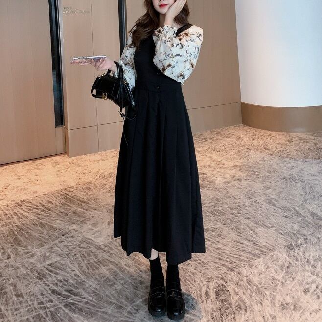 セットアップ 2枚セット ジャンバースカート 長袖ブラウス ビッグサイズ ミドルロング丈 シャーリング ワンピース ゆったり ボタン シングルブレスト 10代 20代 30代 レディース フレア ゆったり オシャレ シック エレガント 大人女性 通勤 通学 オフィス 通勤コーデ 細見え おしゃれ 着やすい ファッショナブル スマート見え スッキリ見え 大人女子 体型カバー 華奢見え ヤセ見え サマ見え こなれ感 M L XL 2XL 3XL 4XL ブラック | Bonny Me