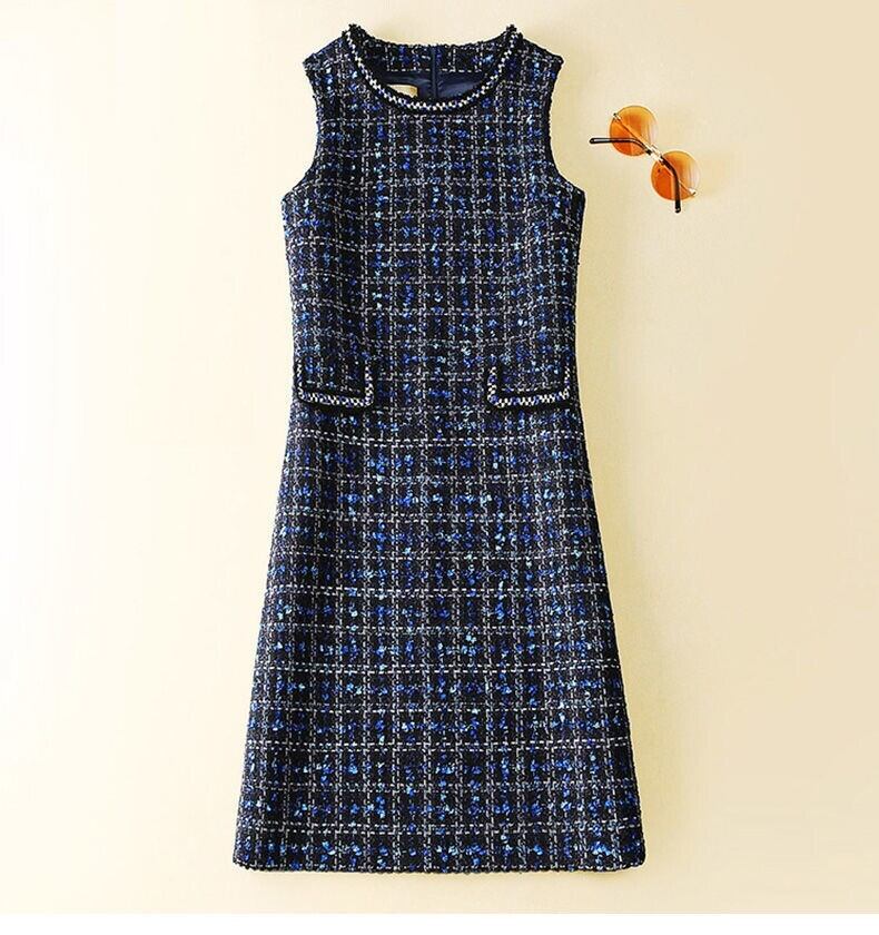 ワンピース 膝丈 ひざ丈 膝上 ノースリーブ ラウンドネック 襟なし スリム タイト Aライン ポケット ハイウエスト ポリエステル かわいい 大人可愛い きれいめ シンプル おしゃれ 大人女子 こなれ感 ガーリー 主役級 存在感 ツイード チェック柄 春 秋 10代 20代 レディース 女性用 デート お出かけ 女子会 休日 パーティー イベント ホテル レストラン 着回し 普段使い 重ね着 韓国系 オルチャン ファッション コーデ スタイル モテ 定番 L XL 2XL 3XL 4XL 青 ブルー | Bonny Me