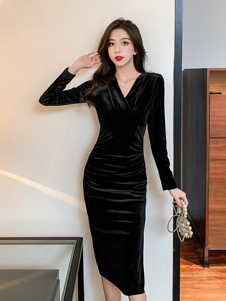 ワンピース デート ワンピドレス 膝丈 ひざ丈 袖あり 長袖 Vネック スリム タイト 細身 スリット かわいい 大人可愛い きれいめ シンプル カジュアル 大人 上品 おしゃれ お洒落 主役級 存在感 春 秋 冬 10代 20代 30代 レディース 女性用 OL 学生 デート お出かけ 公園デビュー 女子会 休日 イベント 旅行 着回し 普段使い ファッション コーデ 楽ちん モテ トレンド 流行 インスタ映え S M L XL 黒 ブラック | Bonny Me