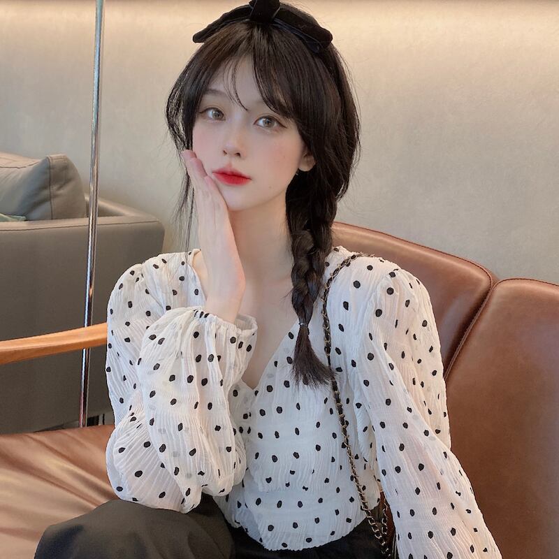 トップス シャツ ブラウス 袖あり 長袖 Vネック シフォン 透け感 かわいい 大人可愛い カジュアル 上品 おしゃれ お洒落 かっこいい 大人女子 こなれ感 ラフ キュート ガーリー 個性的 クール モード系 抜け感 ドット柄 水玉 春 夏 10代 20代 30代 40代 50代 60代 レディース 女性用 ママ デート お出かけ 休日 普段使い お揃い 双子 モテ プレゼント ギフト インスタ映え サイズ S M L XL 色展開 白 ホワイト ブラック 黒 カラバリ | Bonny Me