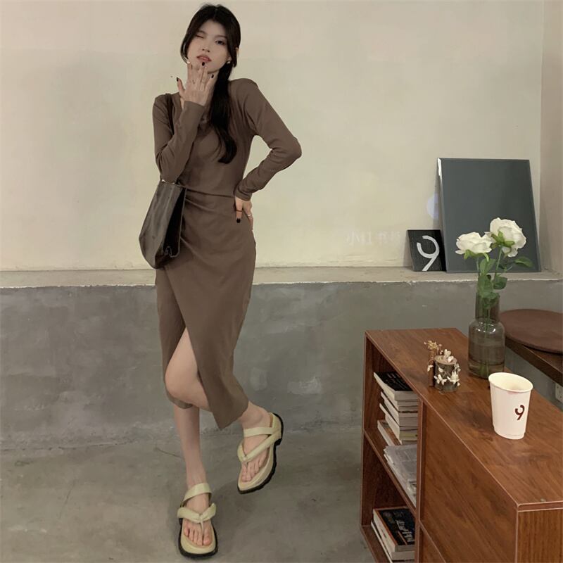 ワンピース デート ミモレ ミモレ丈 袖あり 長袖 スリム タイト 細身 スリット かわいい 大人可愛い きれいめ シンプル カジュアル 大人 上品 おしゃれ お洒落 主役級 存在感 春 秋 10代 20代 30代 レディース 女性用 OL 学生 デート お出かけ 公園デビュー 女子会 休日 イベント 旅行 着回し 普段使い ファッション コーデ 楽ちん モテ トレンド 流行 インスタ映え S M L 黒 ブラック 茶色 ブラウン グレー | Bonny Me