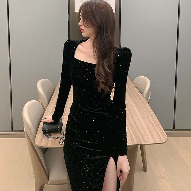 ワンピース ワンピドレス ミモレ ミモレ丈 ロング ロング丈 袖あり 長袖 スクエアネック スリム タイト 細身 スリット サイドスリット 前開き ベロア きれいめ 大人 上品 おしゃれ お洒落 かっこいい 大人女子 こなれ感 ガーリー クール セクシー エレガント モダン 主役級 存在感 フォーマル 春 秋 冬 10代 20代 30代 40代 50代 60代 レディース 女性用 デート お出かけ 休日 パーティー イベント インスタ映え サイズ S M L 色展開 ホワイト ブラック 光沢 | Bonny Me