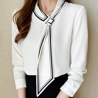 ネクタイ、リボン付きのフェミニンなブラウス。