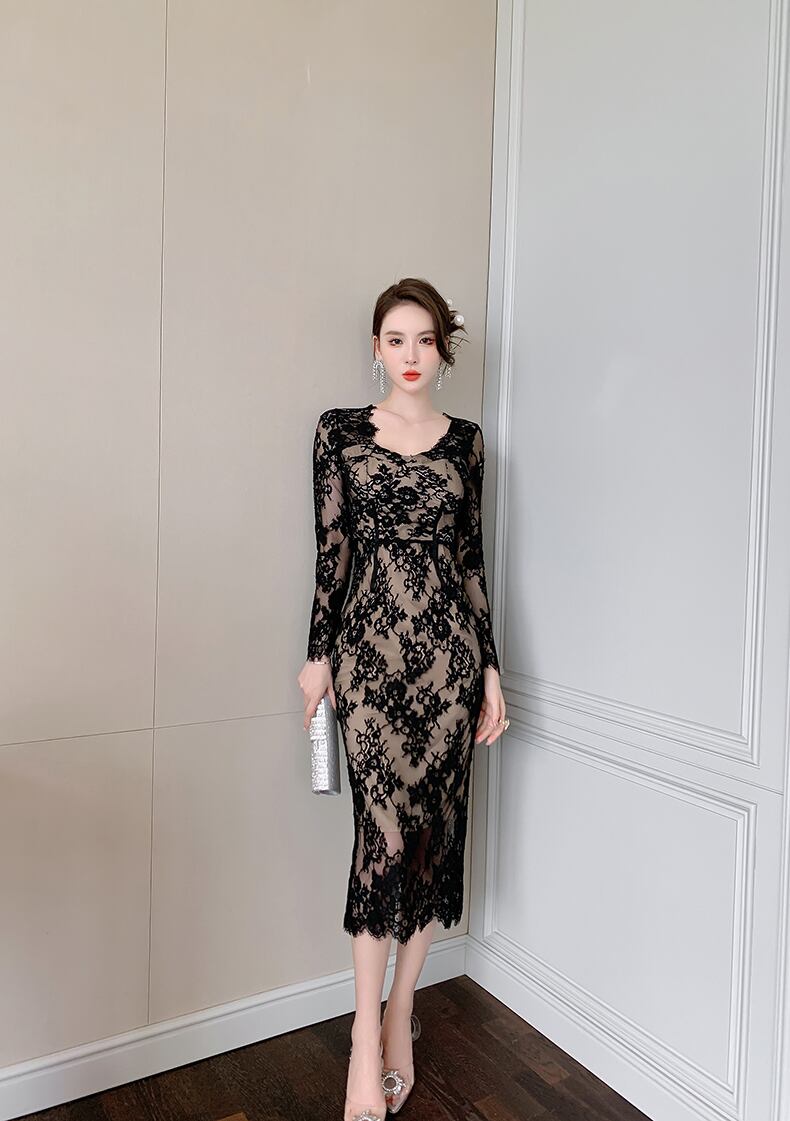 ワンピース デート ミモレ ミモレ丈 袖あり 長袖 スリム タイト 細身 レース かわいい 大人可愛い きれいめ シンプル カジュアル 大人 上品 おしゃれ お洒落 主役級 存在感 春 秋 10代 20代 30代 レディース 女性用 OL 学生 デート お出かけ 公園デビュー 女子会 休日 イベント 旅行 着回し 普段使い ファッション コーデ 楽ちん モテ トレンド 流行 インスタ映え S M L 黒 ブラック | Bonny Me