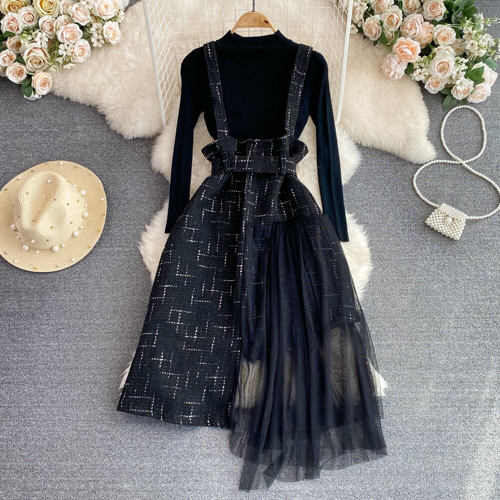トップス スカート ニットソー サロペット フレアスカート チュールスカート ミモレ丈 ロング丈 長袖 ハイネック フレア スリム タイト 切り替えデザイン ドッキング チュール ベルト ウエストマーク リブニット ニット 異素材MIX 上下セット 2点セット 大人可愛い シンプル カジュアル おしゃれ お洒落 かっこいい 大人女子 こなれ感 主役級 存在感 無地 柄 秋 冬 10代 20代 30代 レディース 女性用 デート お出かけ 女子会 休日 着回し 普段使い 重ね着 S M L XL ブラック | Bonny Me