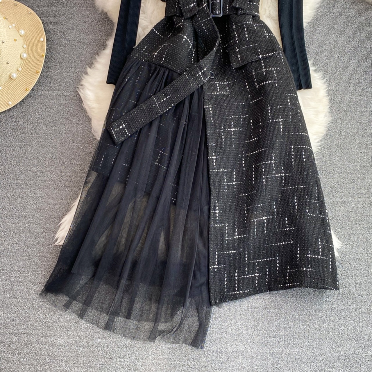 シンプルなリブニットとツイードとチュールのドッキングスカートのセット。