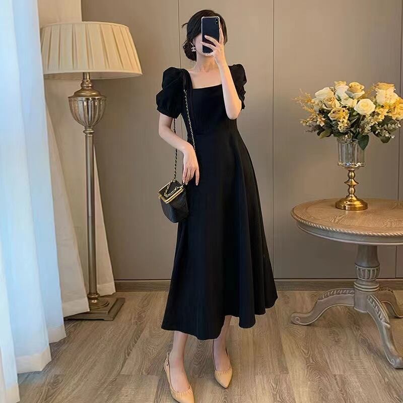 ワンピース ロングスカート Aラインスカート 膝丈 膝下 半袖 スクエアネック Aライン かわいい 大人可愛い きれいめ シンプル 大人 上品 おしゃれ お洒落 大人可愛い 大人女子 こなれ感 無地 夏 20代 30代 レディース 女性用 OL お出かけ 女子会 パーティー イベント ホテル レストラン デート 着回し サイズ S M L XL 色展開 黒 ブラック | Bonny Me