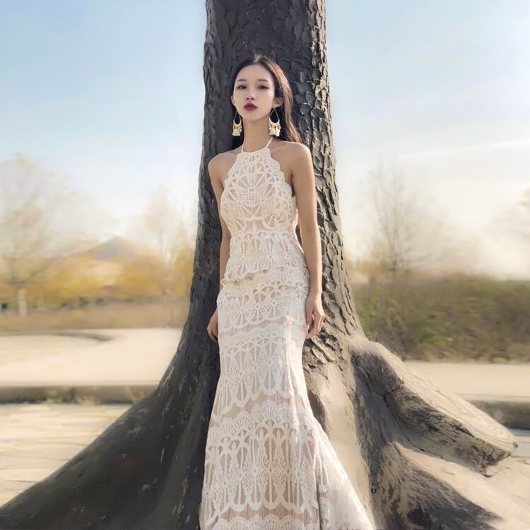 ワンピース ワンピドレス ロング丈 マキシ丈 袖なし 襟なし ホルターネック スリム タイト マーメイド レース バックシャン バックコンシャス 大人可愛い きれいめ シンプル カジュアル おしゃれ お洒落 かっこいい 大人女子 こなれ感 ラフ セクシー エレガント 主役級 存在感 抜け感 柄 夏 10代 20代 30代 レディース 女性用 デート お出かけ 女子会 休日 リゾート 旅行 着回し 普段使い 重ね着 韓国系 オルチャン ファッション スタイル 体系カバー インスタ映え S M L ホワイト | Bonny Me