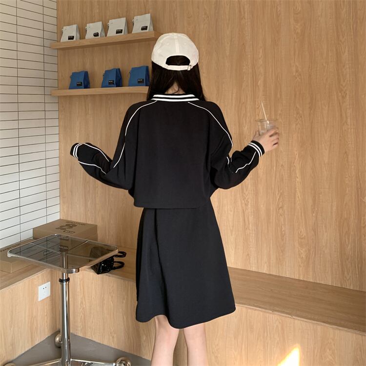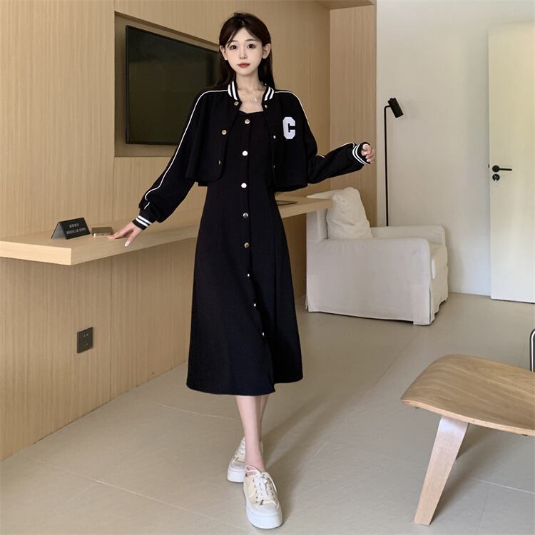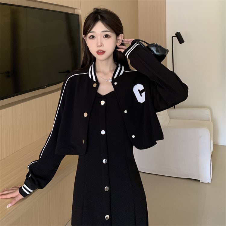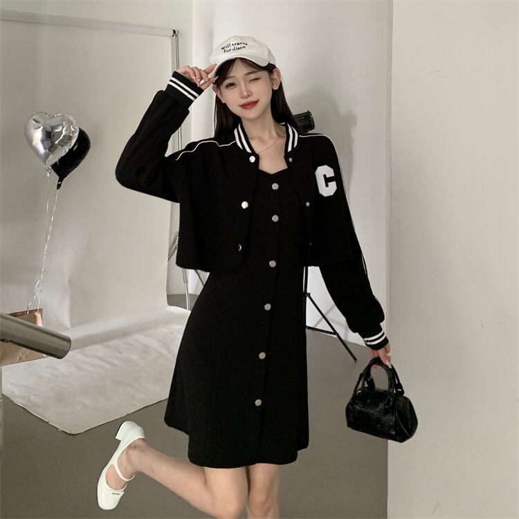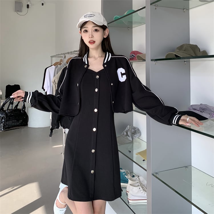 ショート丈のスタジャン風ブルゾンとキャミワンピのセット。