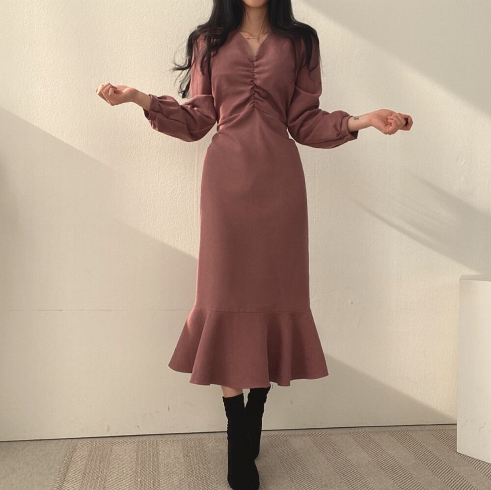 ワンピース デート ミモレ ミモレ丈 袖あり 長袖 Vネック かわいい 大人可愛い きれいめ シンプル カジュアル 大人 上品 おしゃれ お洒落 主役級 存在感 春 秋 冬 10代 20代 30代 レディース 女性用 OL 学生 デート お出かけ 公園デビュー 女子会 休日 イベント 旅行 着回し 普段使い ファッション コーデ 楽ちん モテ トレンド 流行 インスタ映え M L XL 2XL 3XL 黒 ブラック ピンク アプリコット | Bonny Me