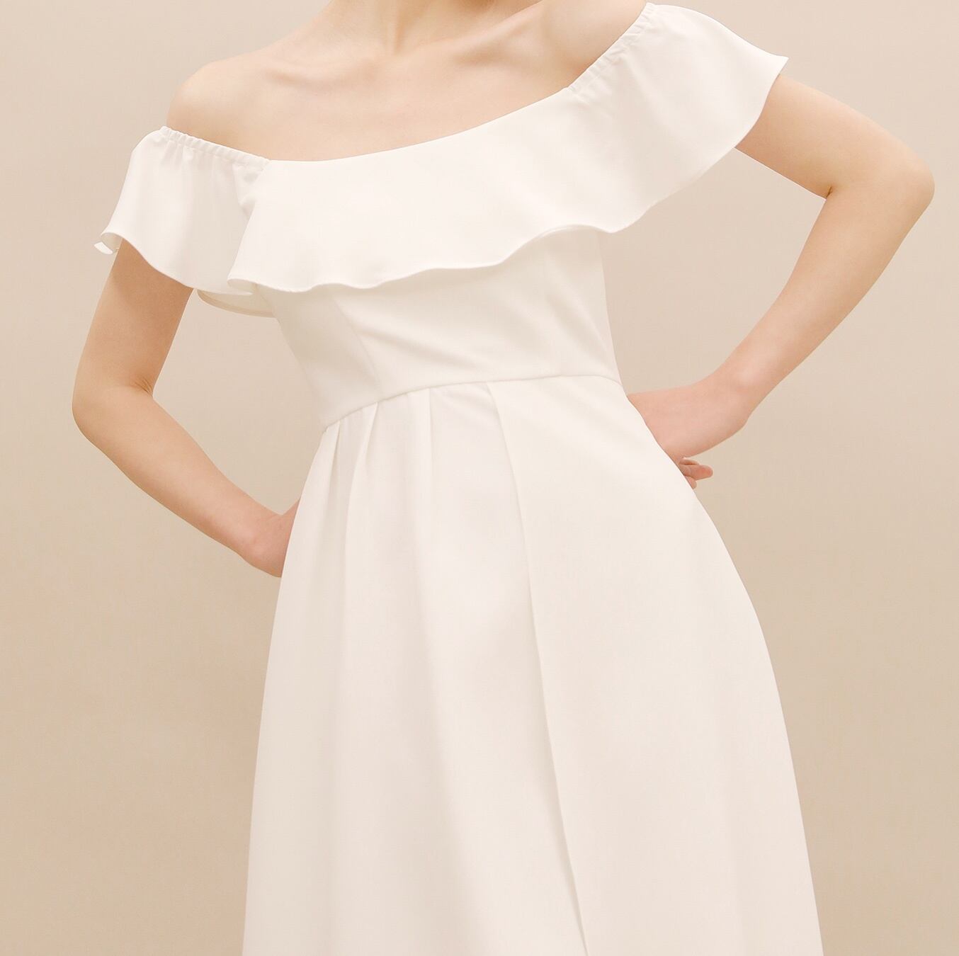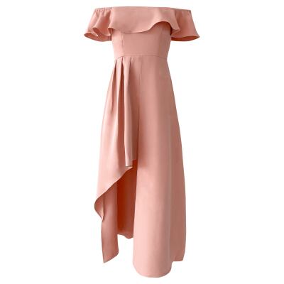 オフショルダーとアシンメトリーな裾がポイントのロングカラードレス。