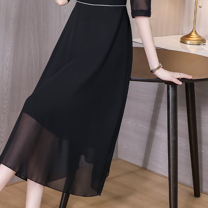 ワンピース ミモレ丈ドレス 膝丈ドレス ワンピースドレス ワンピドレス 膝丈 ひざ丈 ミモレ ミモレ丈 袖あり 5分袖 五分袖 Vネック 切り替えデザイン ドッキング チュール ウエストマーク 透け感 シースルー 上品 おしゃれ お洒落 エレガント クラシック 10代 20代 30代 40代 50代 60代 レディース 女性用 高見え 格上げ インスタ映え 夏 秋 お呼ばれ 発表会 ステージ 撮影 S M L XL 2XL 3XL 4XL 小さいサイズ 大きいサイズ 色展開 黒 ブラック | Bonny Me