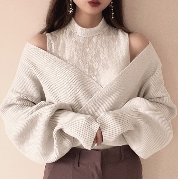 異素材ミックスのオフショルダーのニットソー。