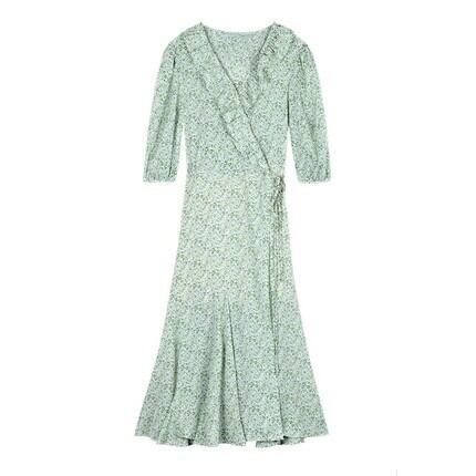 レトロ風 スカート ワンピース ブラウス プリーツスカート ワンピドレス ミモレ ミモレ丈 袖あり 5分袖 五分袖 パフスリーブ Vネック カシュクール フレア Aライン ふりふり フリフリ ひらひら ヒラヒラ フリル ハイウエスト かわいい 大人可愛い おしゃれ お洒落 レトロ 大人可愛い 大人女子 ラブリー キュート ガーリー 個性的 花柄 小花柄 フラワー 春 夏 レディース 女性用 デート お出かけ 旅行 着回し 普段使い 重ね着 韓国 オルチャン S M L XL 青 ブルー 緑 グリーン | Bonny Me