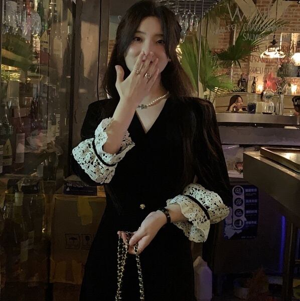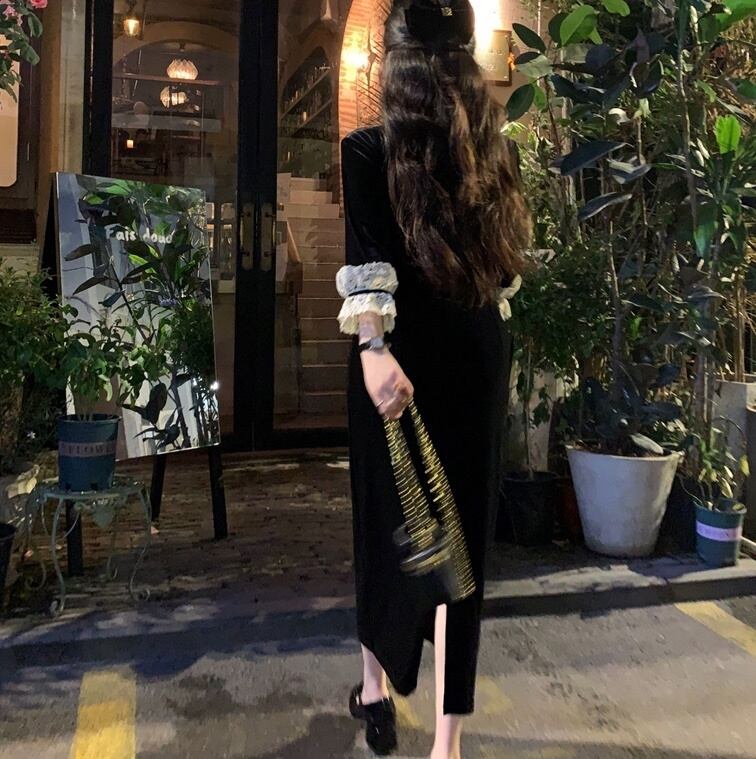 ワンピース ロング ロング丈 マキシ マキシ丈 袖あり 長袖 Vネック ストレート Iライン レース 刺繍 ウエストマーク ベロア 上下セット 2点セット ツーピース きれいめ 大人 上品 おしゃれ お洒落 レトロ 大人女子 こなれ感 ラブリー キュート ガーリー エレガント モダン 無地 秋 冬 10代 20代 30代 40代 50代 60代 レディース 女性用 ママ お出かけ 休日 着回し 普段使い モテ インスタ映え サイズ S M L 小さいサイズ 大きいサイズ 色展開 黒 ブラック | Bonny Me