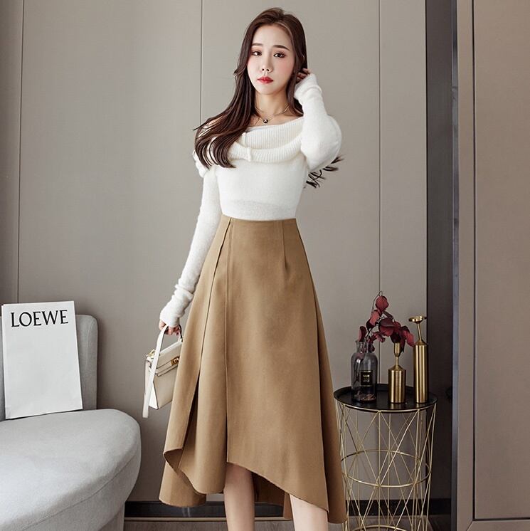 アシンメトリーデザインのシックな色合いの膝丈ツイードスカート。