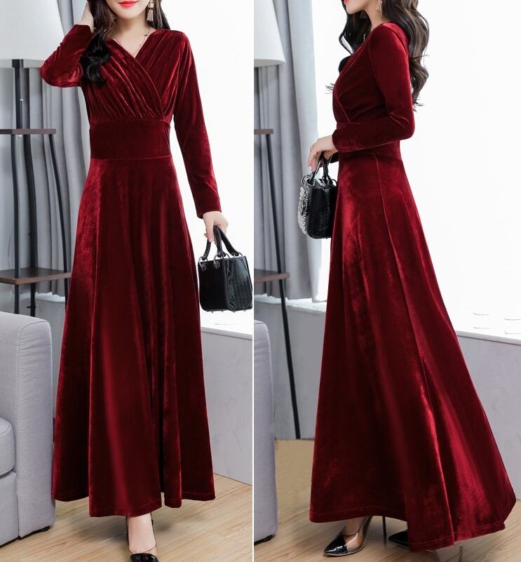 新作 春 秋 冬 ロングドレス 長袖 上品 ワンピース ロング丈 フレア ハイウェスト Vネック Aラインスカート 華やか エレガント ゆったり フォーマル パーティ ホテル 結婚式 式場 女子会 二次会 モテコーデ 学生 OL 着やすい レトロ レディース 20代 30代 韓国 大人女子 オシャレ 細見え ファッショナブル スマート見え スッキリ見え 体型カバー 華奢見え ヤセ見え サマ見え こなれ感 M L XL 2XL 3XL バーガンディ ロイヤルブルー ブラック パープル | Bonny Me