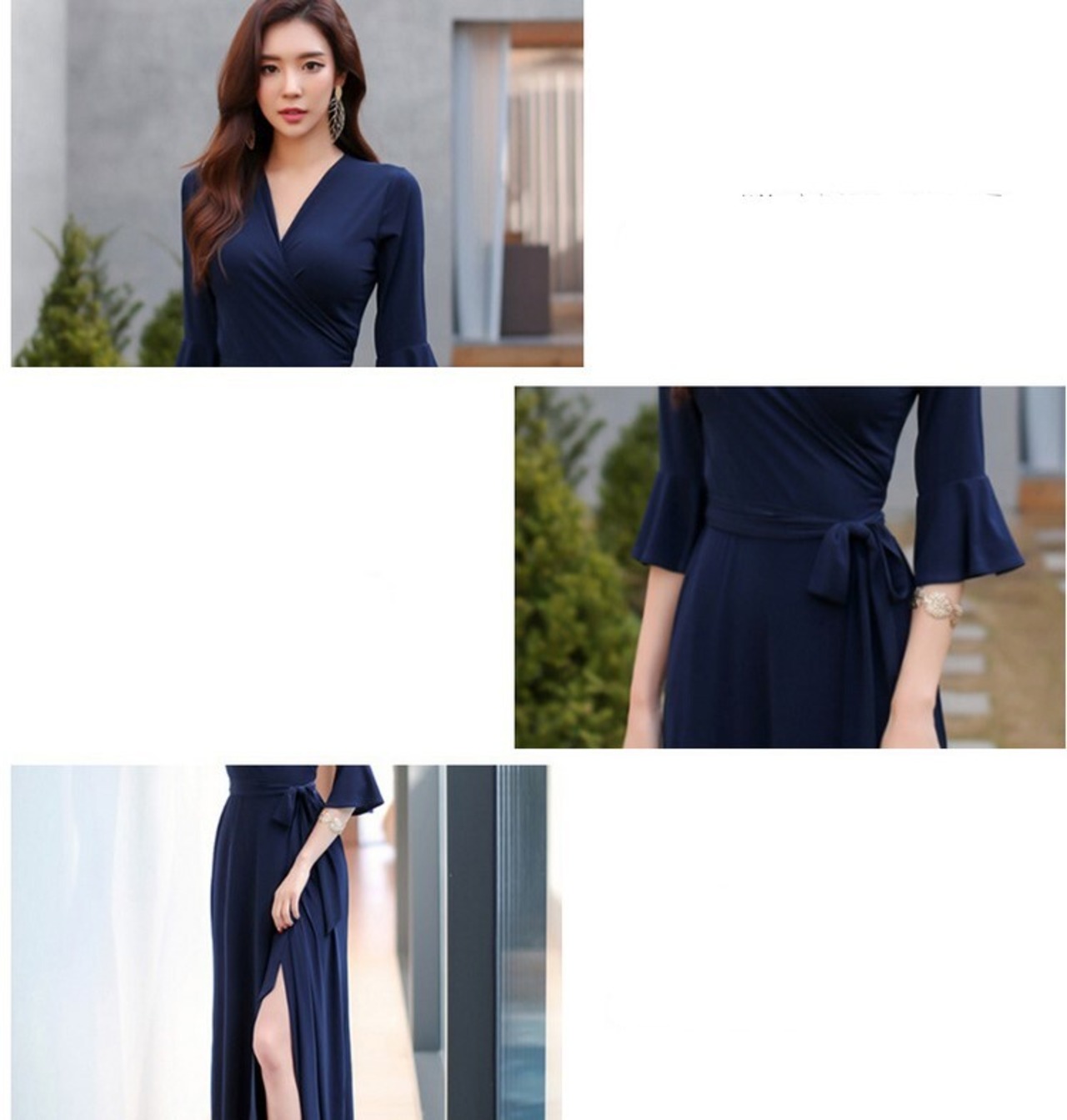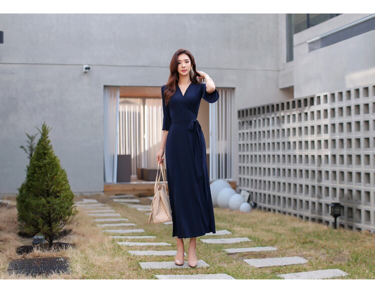 ワンピース フレアワンピース ワンピドレス ロング丈 マキシ丈 袖あり 7分袖 七分袖 Vネック カシュクール 襟なし セミフレア タイト 細身 ウエストマーク ウエストリボン サイドスリット ハイウエスト 大人可愛い きれいめ シンプル 上品 おしゃれ 大人女子 セクシー エレガント 主役級 存在感 無地 春 秋 20代 30代 40代 レディース 女性用 デート お出かけ 女子会 休日 着回し 普段使い 重ね着 韓国系 オルチャン ファッション モテ 体系カバー M L XL 2XL ネイビー | Bonny Me