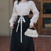 トップス スカート ボトムス セットアップ ニットソー ロングスカート ロング ロング丈 袖あり 長袖 スクエアネック ウエストマーク ウエストリボン ニット 上下セット 2点セット ツーピース お得 大人可愛い おしゃれ お洒落 レトロ 秋 冬 10代 20代 30代 40代 50代 60代 レディース 女性用 ママ 学生 デート お出かけ 休日 普段使い 重ね着 モテ インスタ映え サイズ S M L XL 小さいサイズ 大きいサイズ 色展開 白 ホワイト黒 ブラック 赤 レッド カラバリ | Bonny Me