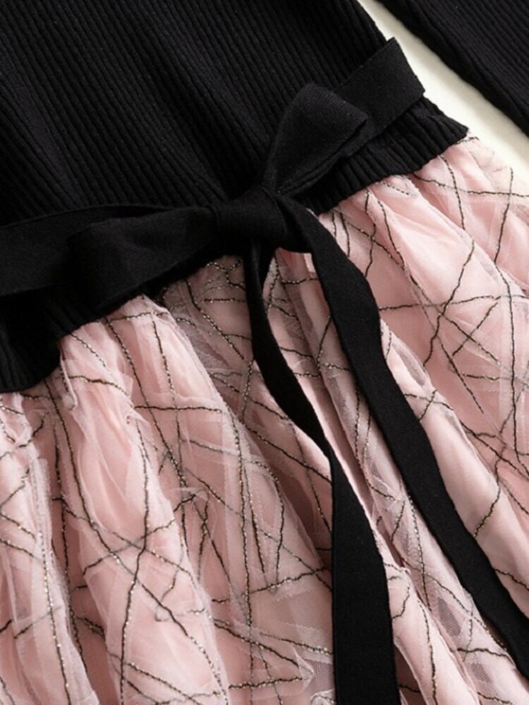 スカート ワンピース ニットソー セーター ロングスカート ミモレ ミモレ丈 7分丈 ミディアム丈 袖あり 長袖 ラウンドネック 襟なし フレア Aライン 切り替えデザイン ドッキング チュール リボン ハイウエスト 透け感 シースルー かわいい 大人可愛い おしゃれ お洒落 大人可愛い 大人女子 ラブリー キュート ガーリー 春 秋 レディース 女性用 デート お出かけ パーティー イベント 着回し 普段使い 重ね着 韓国 オルチャン L XL 2XL 3XL 黒 ブラック ピンク 大きいサイズ | Bonny Me