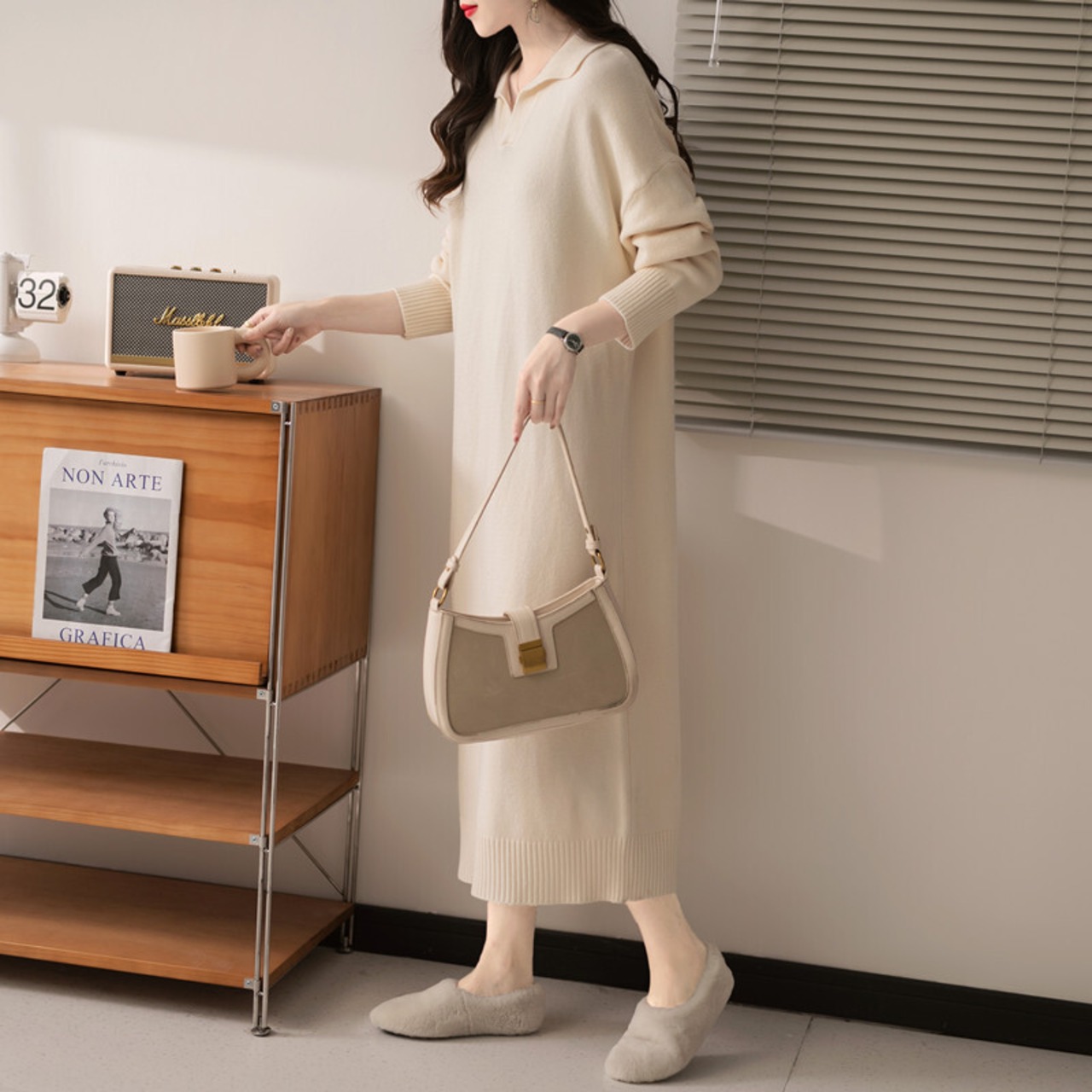 ワンピース ロング ロング丈 マキシ マキシ丈 袖あり 長袖 Vネック 襟付き Iライン ニット かわいい 大人可愛い おしゃれ お洒落 かっこいい 大人女子 こなれ感 ラフ ラブリー キュート ガーリー ルーズ 抜け感 無地 秋 冬 10代 20代 30代 40代 50代 60代 レディース 女性用 ママ お出かけ お泊まり 休日 リゾート 旅行 着回し 普段使い 重ね着 モテ インスタ映え サイズ S M L XL 2XL 小さいサイズ 大きいサイズ 色展開 白 ホワイト ベージュ | Bonny Me