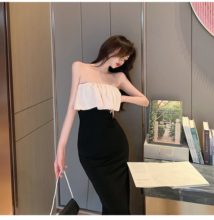 胸元のフリルが可愛くてセクシーなビスチェロングワンピース。