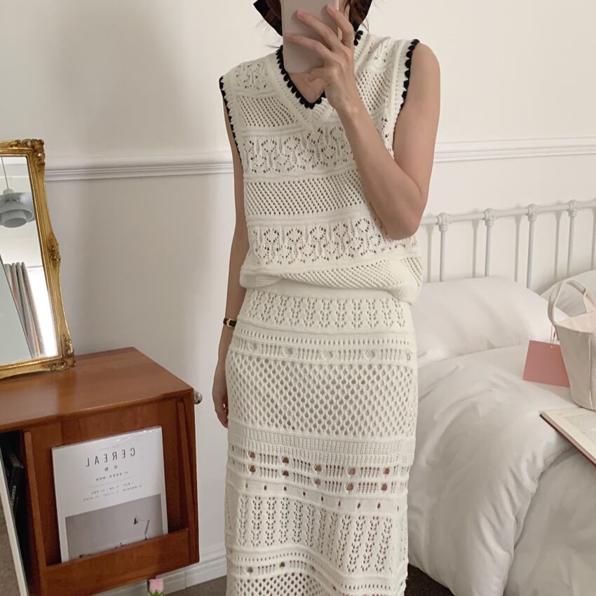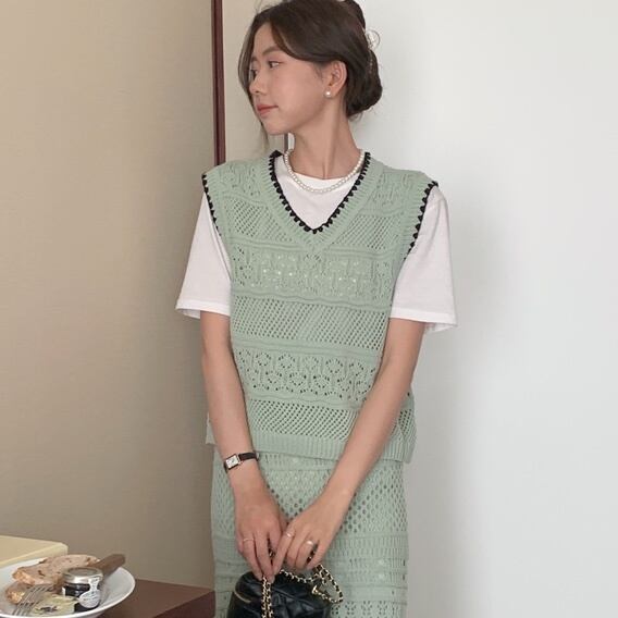 セットアップ ベスト ロングスカート ニットスカート ロング ロング丈 袖なし ノースリーブ タートルネック スタンドカラー 編み込み 透け感 サマーニット 上下セット 2点セット ツーピース かわいい 大人可愛い おしゃれ お洒落 レトロ 大人女子 こなれ感 キュート ガーリー 抜け感 春 夏 10代 20代 30代 40代 50代 60代 レディース 女性用 ママ デート お出かけ 休日 着回し インスタ映え サイズ S M L フリーサイズ ワンサイズ 色展開 白 ホワイト 緑 グリーン | Bonny Me