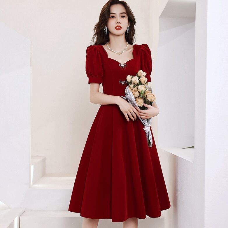 ドレス ワンピース カラードレス 膝丈ドレス フォーマルドレス Aラインドレス 膝丈 ひざ丈 袖あり 半袖 スクエアネック Aライン シフォン フリル バックシャン バックコンシャス かわいい 大人可愛い モダン エレガント ラブリー キュート ガーリー 10代 20代 30代 40代 50代 60代 レディース 女性用 パーティー イベント インスタ映え 披露宴 お呼ばれ S M L XL 2XL 3XL 小さいサイズ 大きいサイズ 大きい 大きめ ビッグサイズ ぽっちゃり 色展開 赤 レッド | Bonny Me