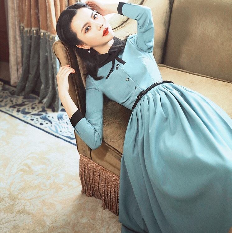 ワンピース 膝下 ミモレ ミモレ丈 袖あり 長袖 Vネック 襟付き フレア Aライン リボン ベルト ウエストマーク かわいい 大人可愛い 上品 おしゃれ お洒落 かっこいい レトロ エレガント 主役級 存在感 春 秋 冬 10代 20代 30代 40代 50代 60代 レディース 女性用 ママ 学生 デート お出かけ 休日 イベント ホテル 着回し 普段使い 重ね着 お揃い 双子 モテ インスタ映え サイズ S M L 小さいサイズ 大きいサイズ 色展開 青 ブルー | Bonny Me