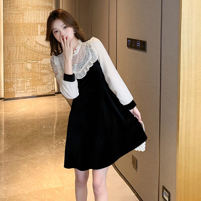 デコルテのビーズとフリルがエレガントなベロアのワンピース。