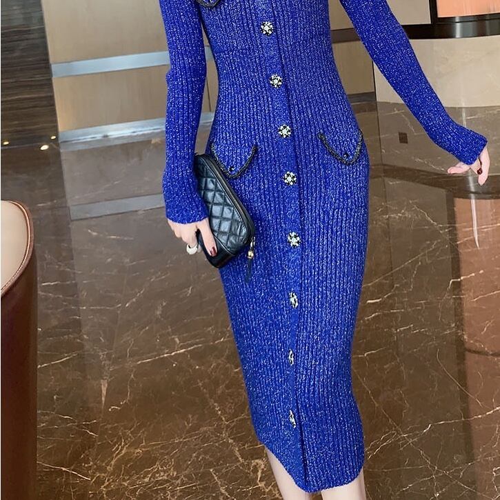 ワンピース ミモレ ミモレ丈 ロング ロング丈 袖あり 長袖 Uネック ラウンドネック ポケット ニット かわいい 大人可愛い おしゃれ お洒落 かっこいい レトロ 大人可愛い 大人女子 こなれ感 ガーリー 個性的 エレガント 秋 冬 10代 20代 30代 40代 50代 60代 レディース 女性用 ママ お出かけ 休日 着回し 普段使い 重ね着 お揃い 双子 楽ちん モテ インスタ映え サイズ S M L XL 小さいサイズ 大きいサイズ 色展開 白 ホワイト 青 ブルー カラバリ | Bonny Me