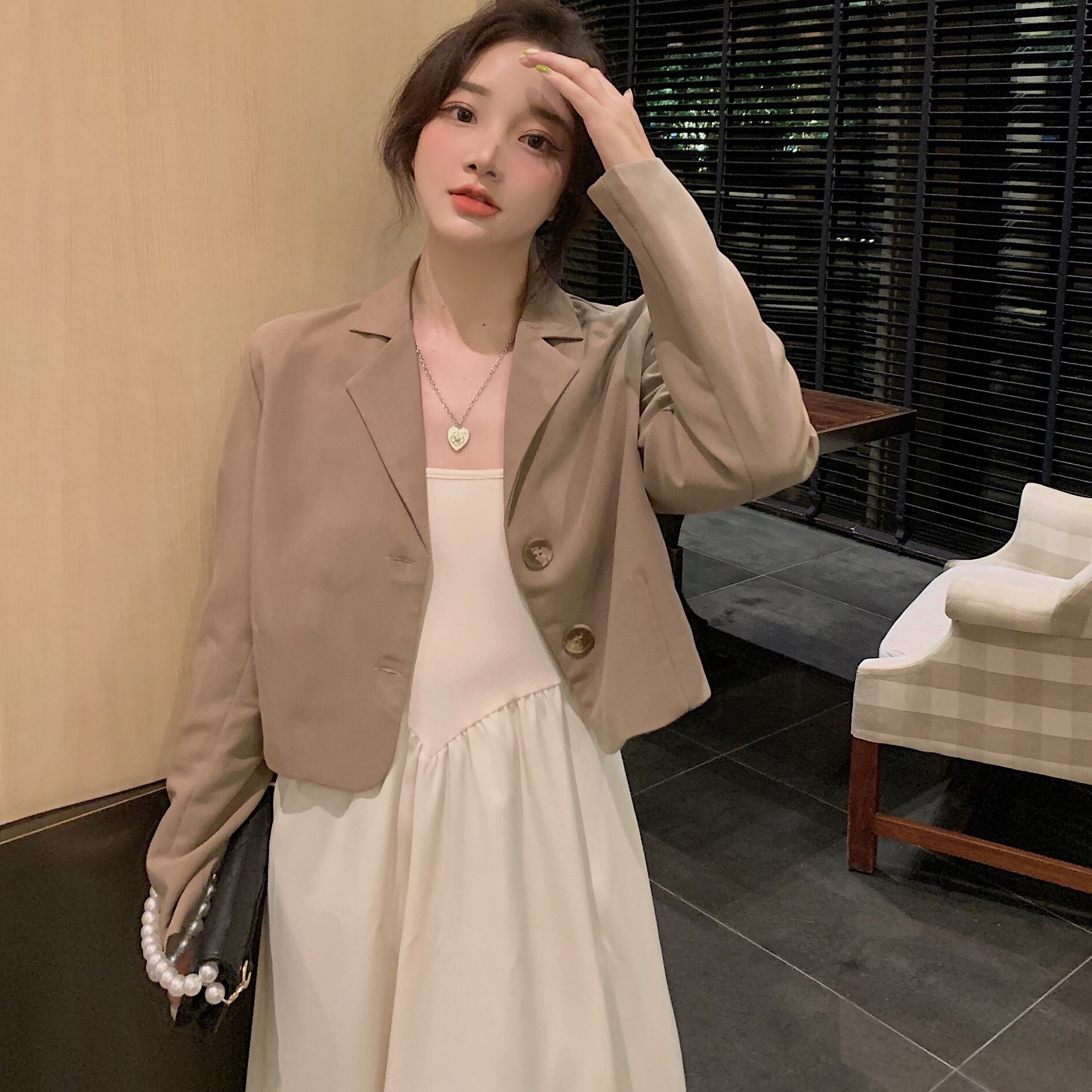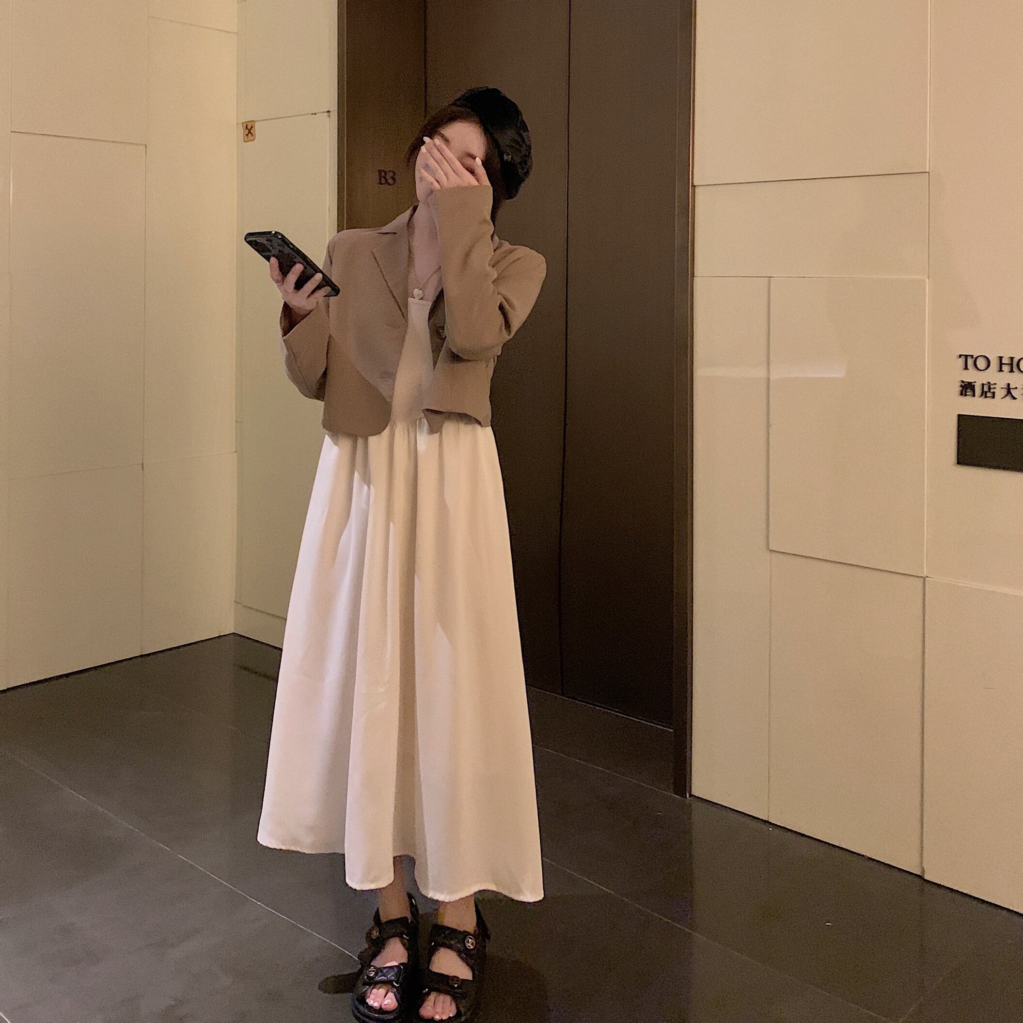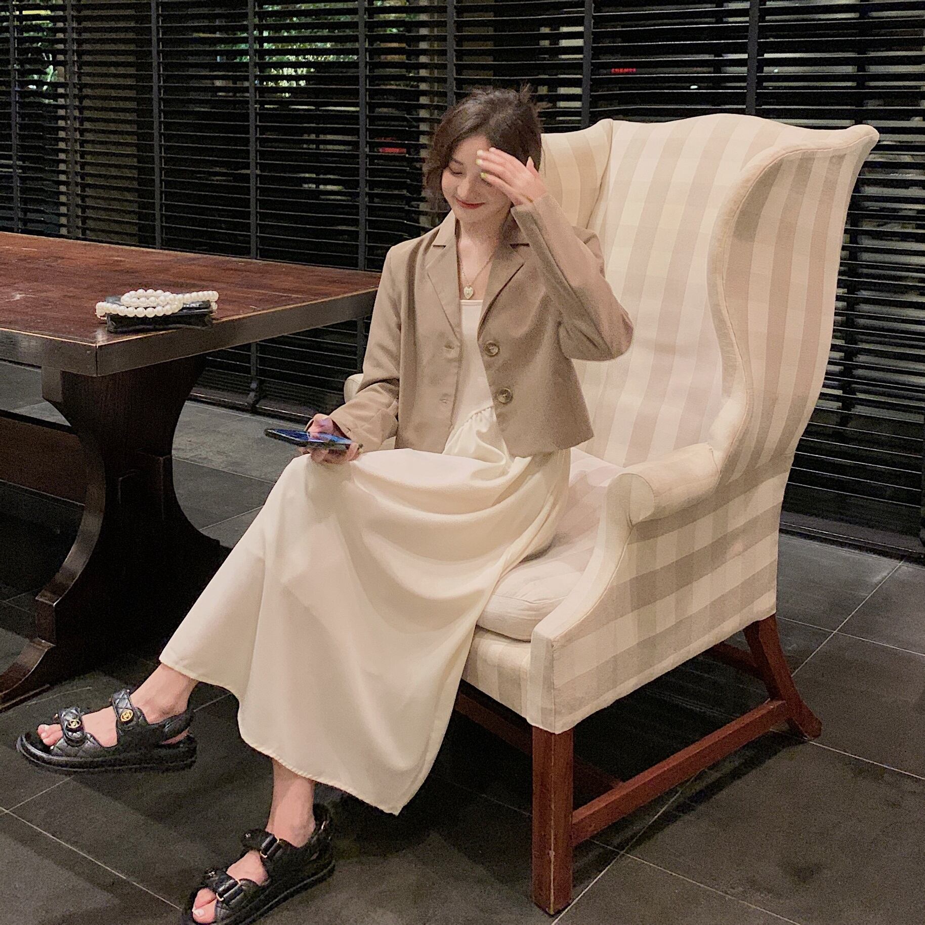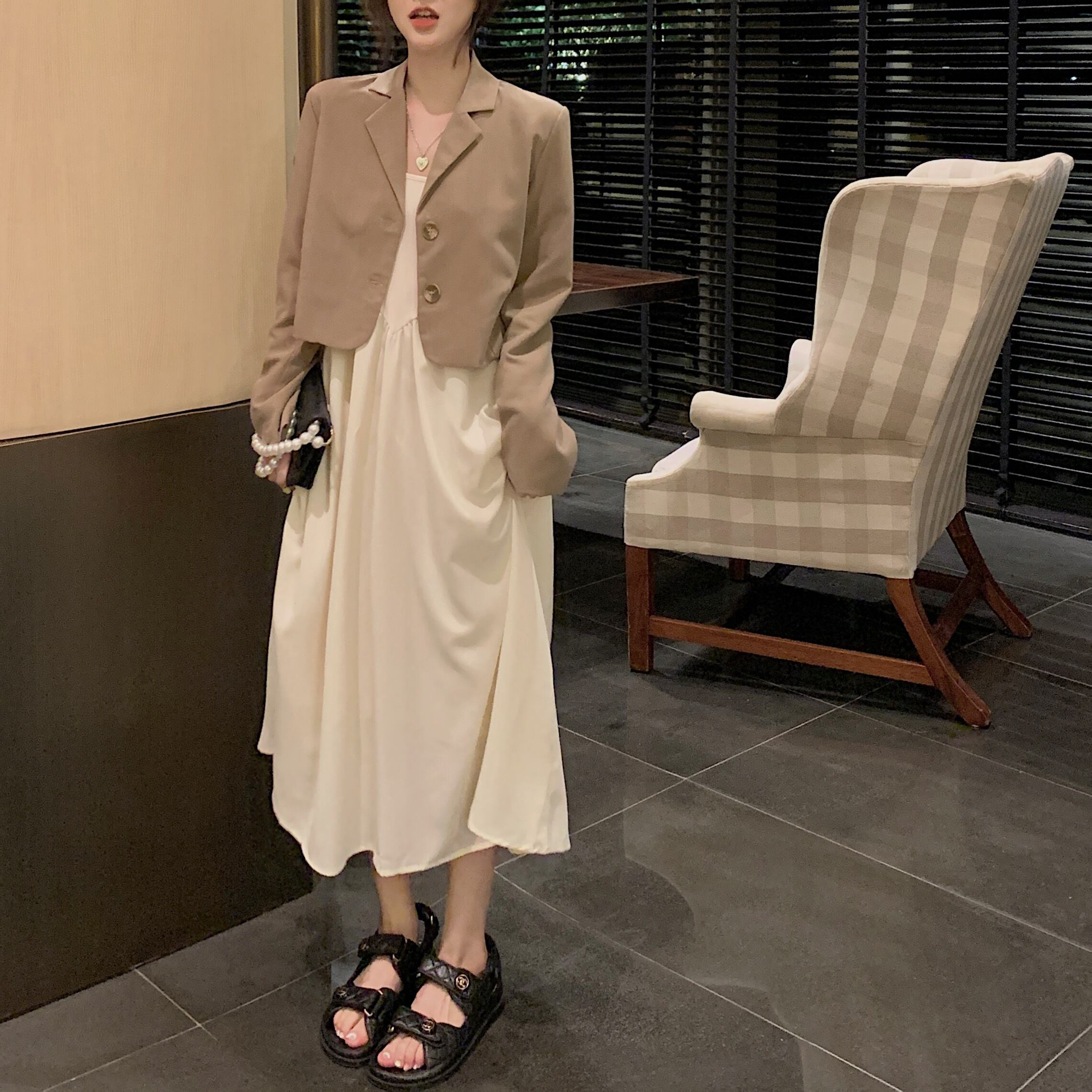 シンプルなロングキャミソールワンピースとバックのリボンがかわいいジャケット。