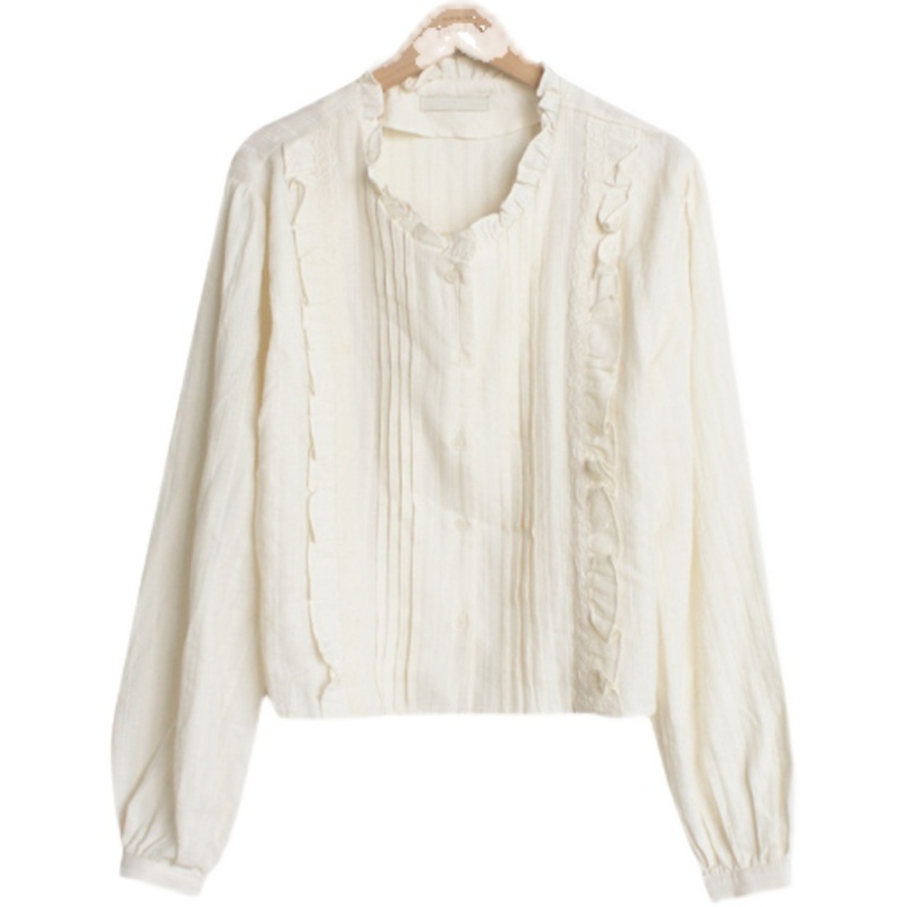 トップス シャツ ブラウス 袖あり 長袖 スタンドカラー フリル 前開き 薄手 かわいい 大人可愛い シンプル おしゃれ お洒落 かっこいい レトロ こなれ感 ラブリー キュート ガーリー 無地 春 秋 冬 10代 20代 30代 40代 50代 60代 レディース 女性用 ママ 女の子 OL 通勤 学生 通学 デート お出かけ 休日 着回し 普段使い 重ね着 モテ インスタ映え サイズ S M L XL 小さいサイズ 大きいサイズ 色展開 白 ホワイト | Bonny Me