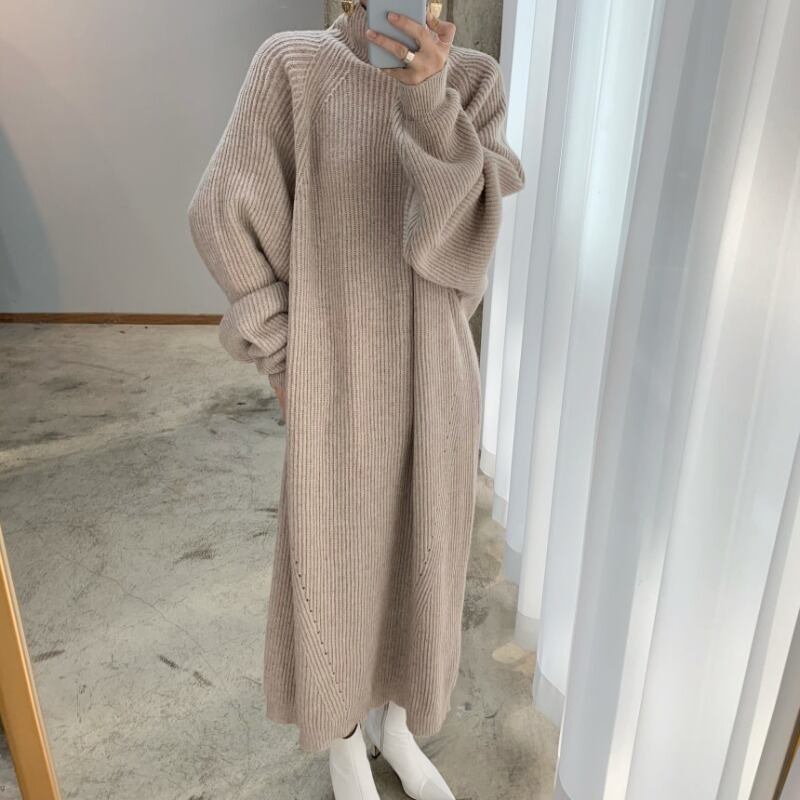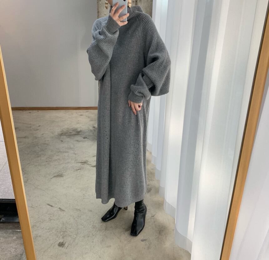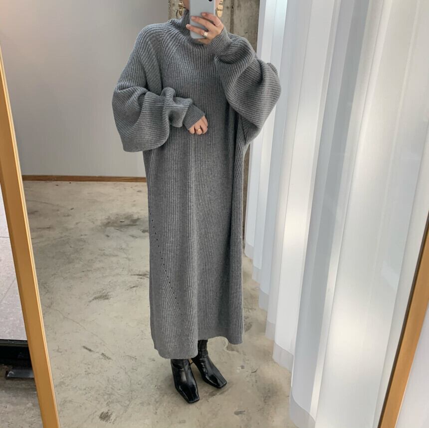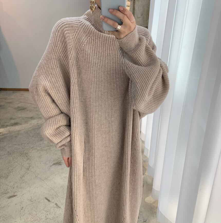 オーバーサイズのハイネックのニットワンピース。