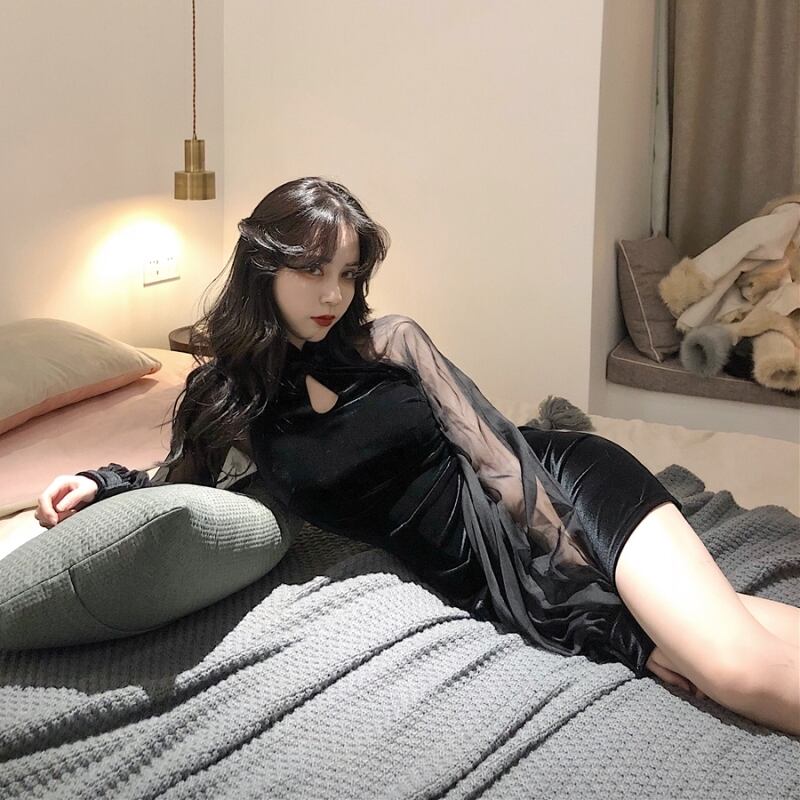 ワンピース セクシードレス ボディコン ミニ ミニ丈 袖あり 長袖 スタンドカラー スリット サイドスリット 切り替えデザイン ドッキング 透け感 シースルー ベロア ベルベット 異素材MIX おしゃれ お洒落 かっこいい 主役級 存在感 ゴージャス 華やか チャイナ チャイナ風 無地 10代 20代 30代 40代 50代 60代 レディース 女性用 パーティー イベント インスタ映え 秋 冬 S M L 小さいサイズ 大きいサイズ 色展開 黒 ブラック 赤 レッド 光沢 | Bonny Me