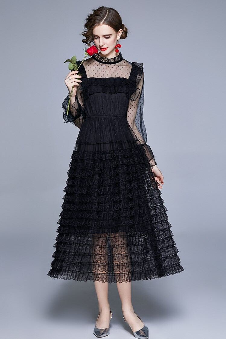 ワンピース ロングスカート 長袖 襟なし かわいい 大人可愛い きれいめ シンプル 大人 上品 おしゃれ お洒落 かっこいい レトロ 大人可愛い 大人女子 クール モード系 エレガント ドット柄 20代 30代 レディース 女性用 OL デート お出かけ 女子会 お泊まり 休日 パーティー イベント ホテル レストラン 韓国 韓国系 オルチャン ファッション コーデ スタイル 体系カバー サイズ S M L XL 2XL 色展開 黒 ブラック | Bonny Me