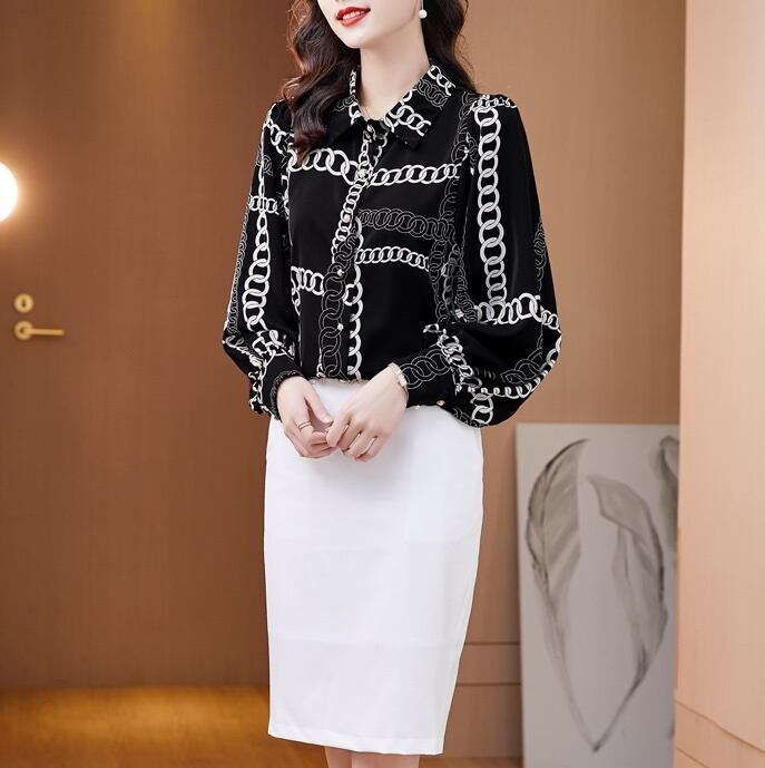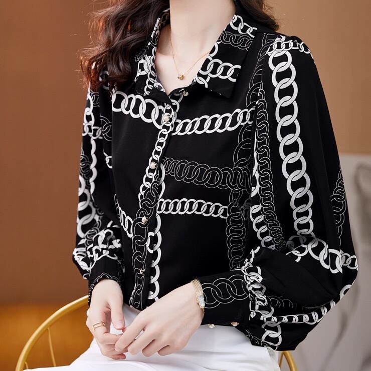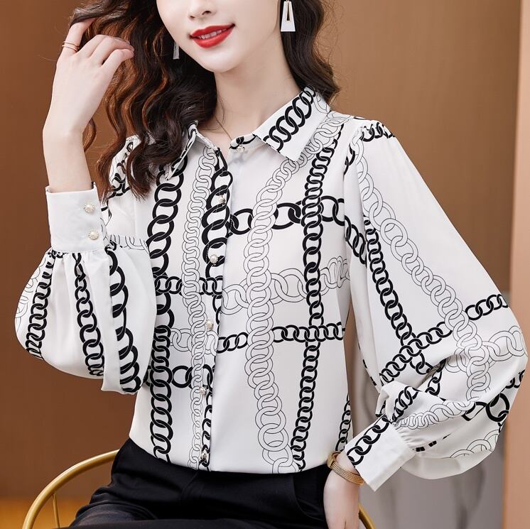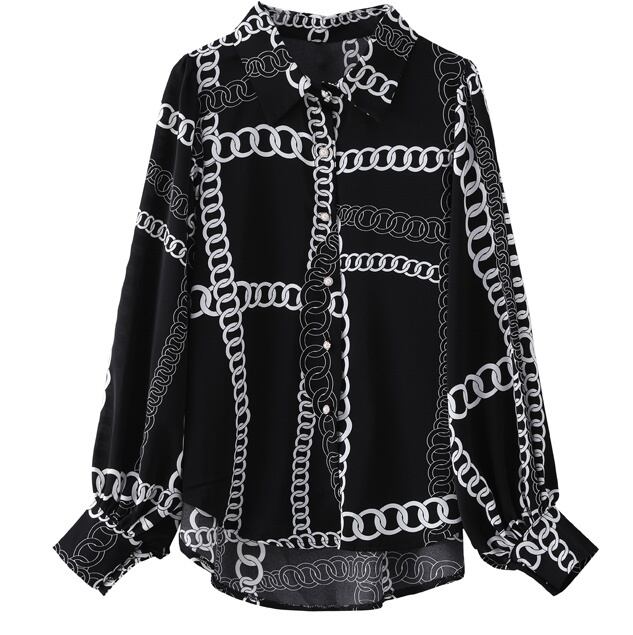 チェーン柄のレトロ可愛い長袖ブラウス。
