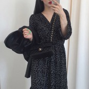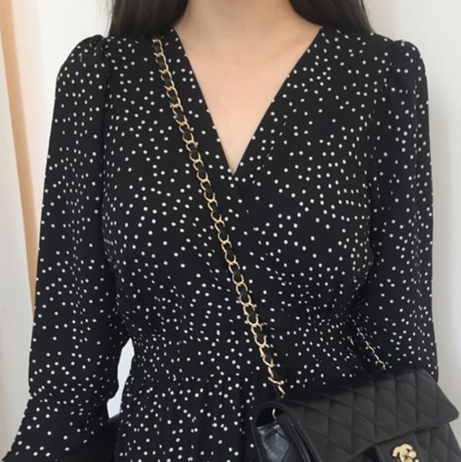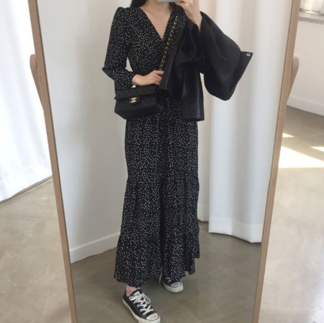 ワンピース ロング ロング丈 マキシ マキシ丈 袖あり 長袖 Vネック フレア Aライン フリル ウエストマーク ハイウエスト 薄手 きれいめ 大人 上品 おしゃれ お洒落 かっこいい レトロ 大人女子 ラブリー キュート ガーリー ドット柄 水玉 春 秋 10代 20代 30代 40代 50代 60代 レディース 女性用 ママ デート お出かけ 休日 着回し 普段使い 重ね着 楽ちん モテ 体形カバー インスタ映え サイズ S M L 小さいサイズ 大きいサイズ 色展開 黒 ブラック | Bonny Me