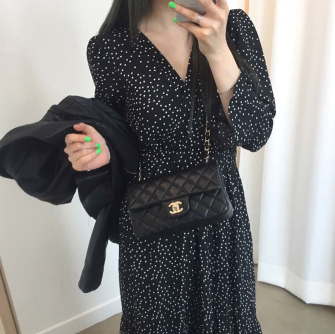 フリルがガーリーな水玉の長袖ロングワンピース。