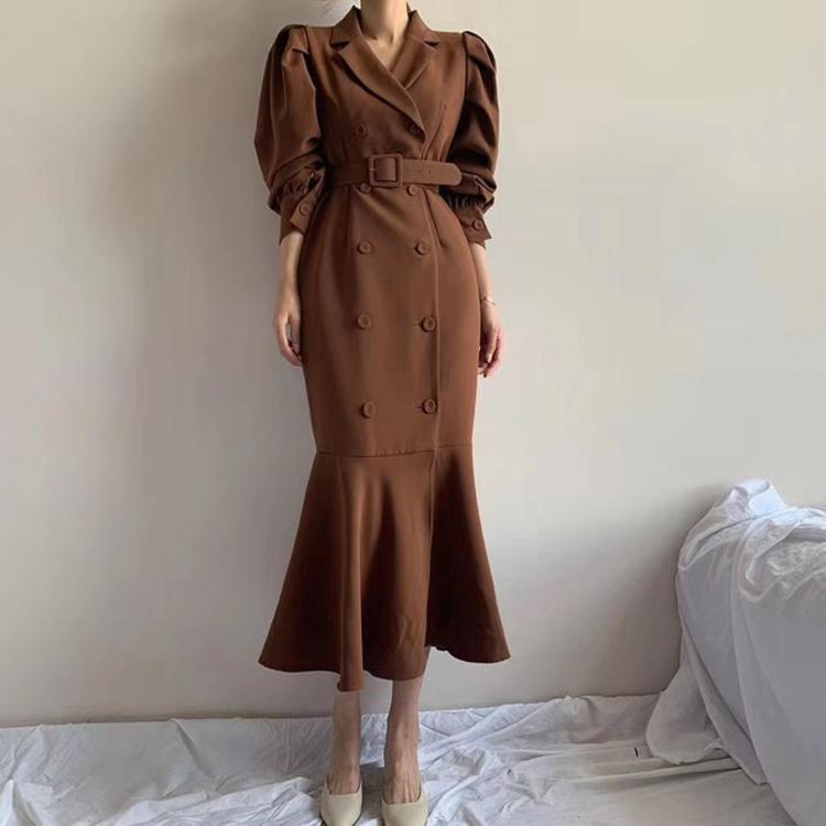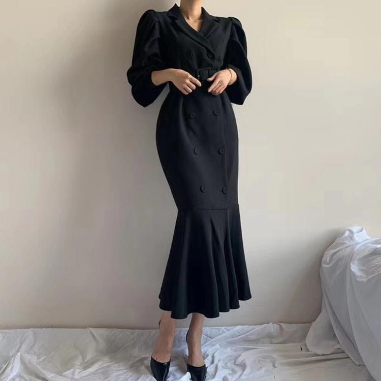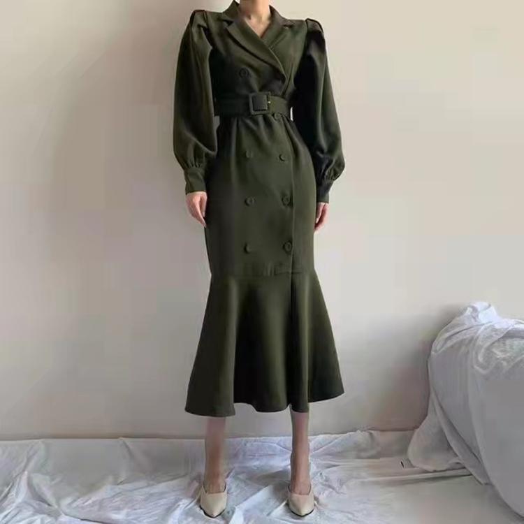 フィッシュテールワンピース ワンピース マキシ丈 袖あり 長袖 ボリューム袖 Vネック スリム タイト マーメイド 切り替えデザイン ベルト ウエストマーク ハイウエスト 薄手 大人 上品 おしゃれ かっこいい レトロ 大人可愛い 大人女子 こなれ感 ラブリー キュート 無地 入学式 入園式 卒業式 卒園式 謝恩会 20代 30代 40代 お出かけ パーティー イベント 旅行 ホテル ガーデン レストラン 韓国系 体系カバー 美脚 脚長 S M L XL ブラック グリーン ブラウン | Bonny Me