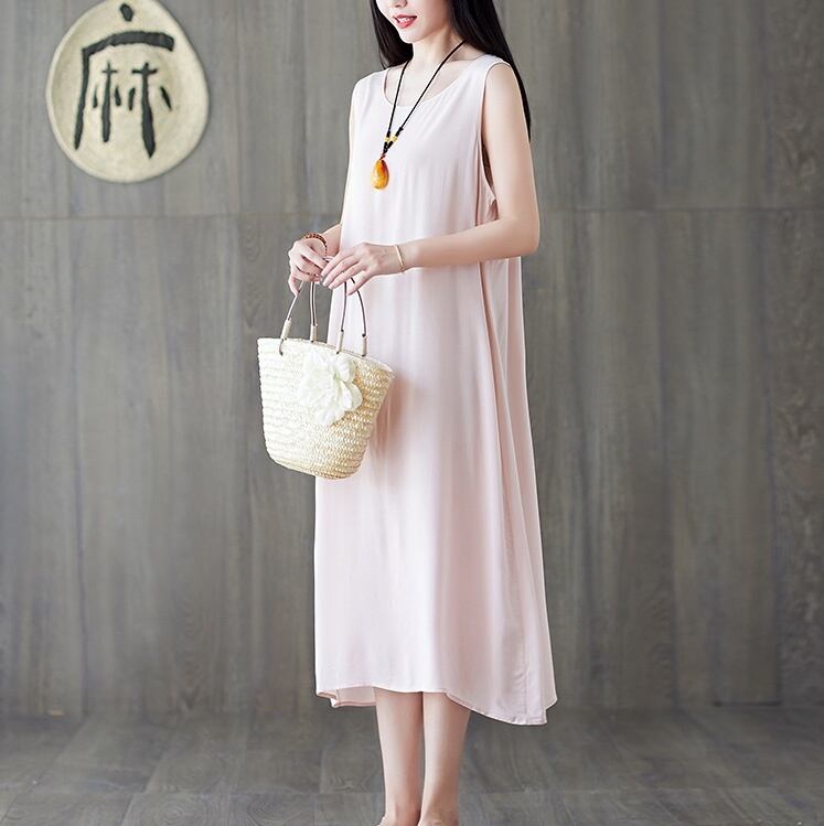 カジュアルなノースリーブのミモレ丈ワンピース。