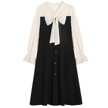 ワンピース 膝下 ミモレ ミモレ丈 袖あり 長袖 Vネック Aライン リボン 切り替えデザイン ドッキング 透け感 かわいい 大人可愛い きれいめ 上品 おしゃれ お洒落 エレガント 大人 上品 クラシック ラブリー キュート ガーリー ドット柄 水玉 10代 20代 30代 40代 50代 60代 レディース 女性用 お出かけ パーティー イベント インスタ映え お呼ばれ L XL 2XL 3XL 4XL 大きいサイズ 大きい 大きめ ビッグサイズ ぽっちゃり 色展開 白 ホワイト 黒 ブラック | Bonny Me